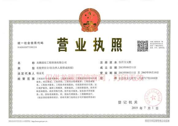 龍騰國信工程咨詢有限公司注冊資本金5000萬元,具有建設部頒發的工程造價咨詢企業甲級資質和招標代理資質。我司具有中國建設工程造價管理協會AAA級信用企業、湖南省建設工程造價管理協會AAA級信用企業、湖南省建設工程造價管理協會優秀會員單位、湖南省招標投標協會優秀會員單位,同時連續多年被評委“湖南省守合同重信用”企業。